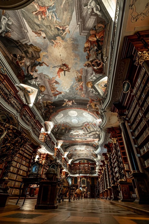 No Mosteiro de Strahov, em Praga, encontra-se uma biblioteca barroca considerada uma das mais belas do planeta. Com tetos pintados e estantes que guardam milhares de volumes antigos, é uma viagem ao passado.