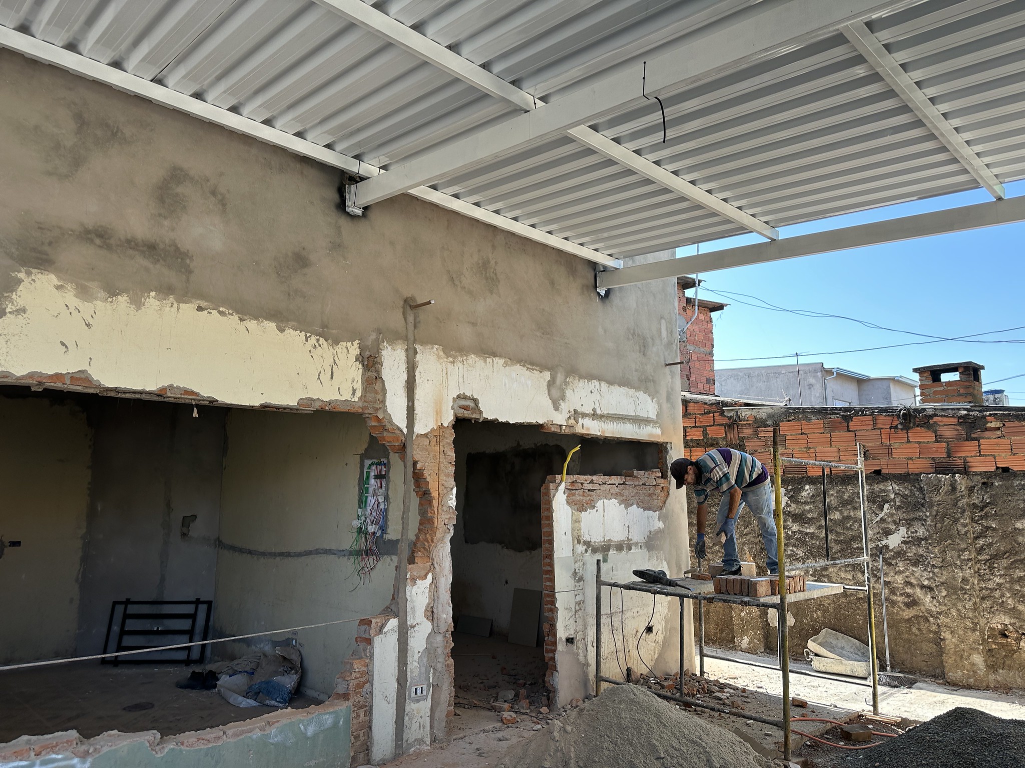 Até o momento, já foram executados serviços de cobertura, intervenções estruturais, contrapiso, troca dos padrões de energia elétrica e água, além de serviços de alvenaria e instalações hidráulicas e elétricas.
