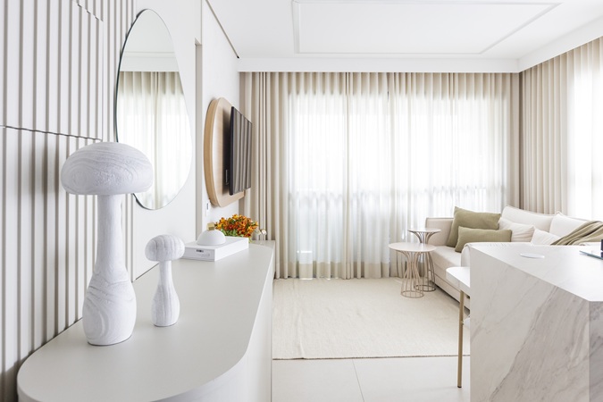 Outro destaque fica por conta da cor predominante do apartamento: o branco, na mesma tonalidade da cor escolhida pela Pantone como cor de 2026, o Cloud Dancer. “A escolha desse tom arejado e neutro somou-se tanto na sensação de aconchego, quanto na ampliação do espaço. Nesse projeto, provamos como a cor entrega uma vivacidade tranquila aos ambientes”, pontua Mari.