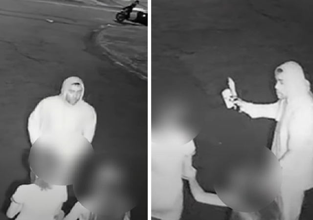 As adolescentes são surpreendidas e encurraladas. Uma delas chega a recuar enquanto o homem faz gestos com a arma e exige a entrega de objetos.