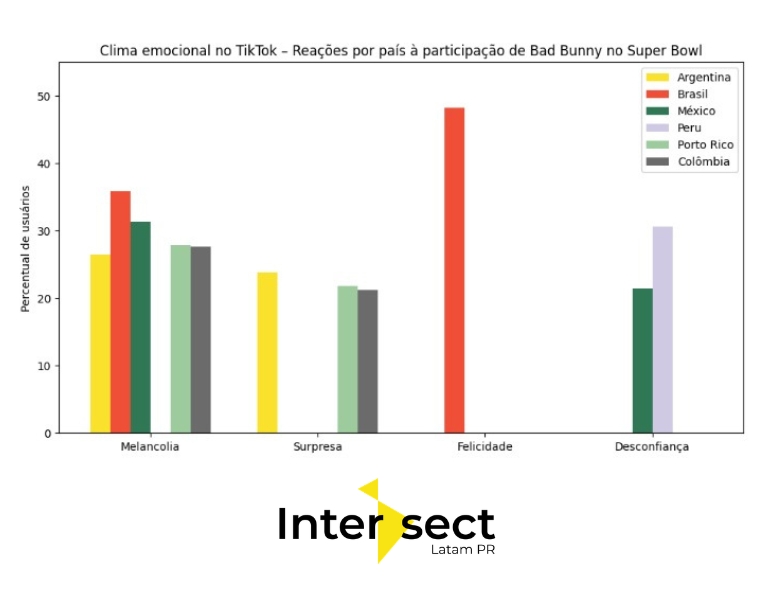 Na terra natal de Bunny, 27,9% dos usuários expressaram melancolia, possivelmente relacionada ao peso simbólico de ver, pela primeira vez, um show de intervalo liderado em espanhol. Já 21,8% reagiram com surpresa, talvez em resposta ao momento em que o artista mencionou, com orgulho, os 35 países que compõem o continente americano, gesto interpretado como afirmação de identidade e orgulho coletivo.