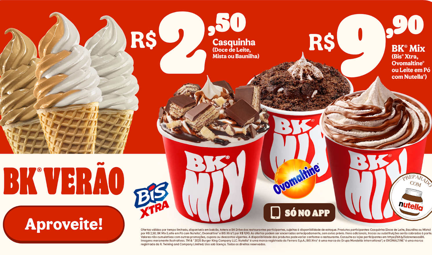 Ofertas válidas por tempo limitado, disponíveis em balcão, totens e BK Drive dos restaurantes participantes, sujeitas à disponibilidade de estoque. Produtos participantes: Casquinha (Doce de Leite, Baunilha ou Mista) por R$ 2,50, BK Mix (Leite em Pó com Nutella®, Ovomaltine® ou BIS Xtra®) por R$ 9,90 mediante ativação no aplicativo para resgate nos canais disponíveis. As ofertas e itens podem ser encerrados antecipadamente, sem aviso prévio. Itens adicionais, trocas ou substituições serão cobrados à parte. Valores não cumulativos com outras promoções, cupons ou descontos vigentes. A disponibilidade dos produtos pode variar conforme o restaurante. Consulte as lojas participantes em https://bit.ly/SobremesasBK. Imagens meramente ilustrativas. TM & © 2025 Burger King Company LLC. Nutella® é uma marca registrada da Ferrero S.p.A.; BIS Xtra® é uma marca do Grupo Mondelēz International®; e OVOMALTINE® é uma marca registrada da R. Twining and Company Limited. Uso sob licença. Todos os direitos reservados. Uso sob licença. Todos os direitos reservados.