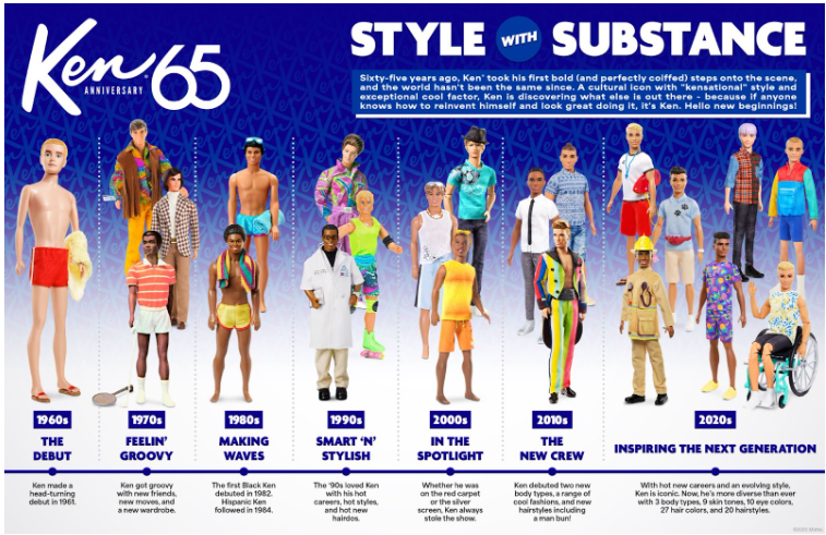 Desde sua estreia em 1961, o boneco Ken tem cativado gerações com sua personalidade divertida e autêntica. Para Nathan Baynard, Vice-Presidente e Head da Barbie na Mattel, este marco representa um momento de reinvenção. “Estamos orgulhosos de celebrar seu 65º aniversário como um momento de descoberta, em que ele pisa em territórios ainda não explorados”, afirma Baynard.
