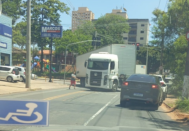 Caminhão ‘enrosca’ nos fios do farol na Paschoal Ardito