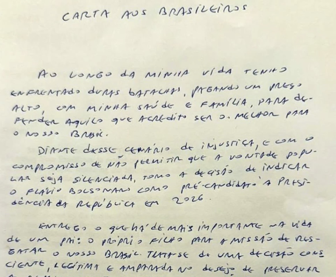 Diante desse cenário de injustiça, e com o compromisso de não permitir que a vontade popular seja silenciada, tomo a decisão de indicar o Flávio Bolsonaro como pré-candidato à Presidência da República em 2026.