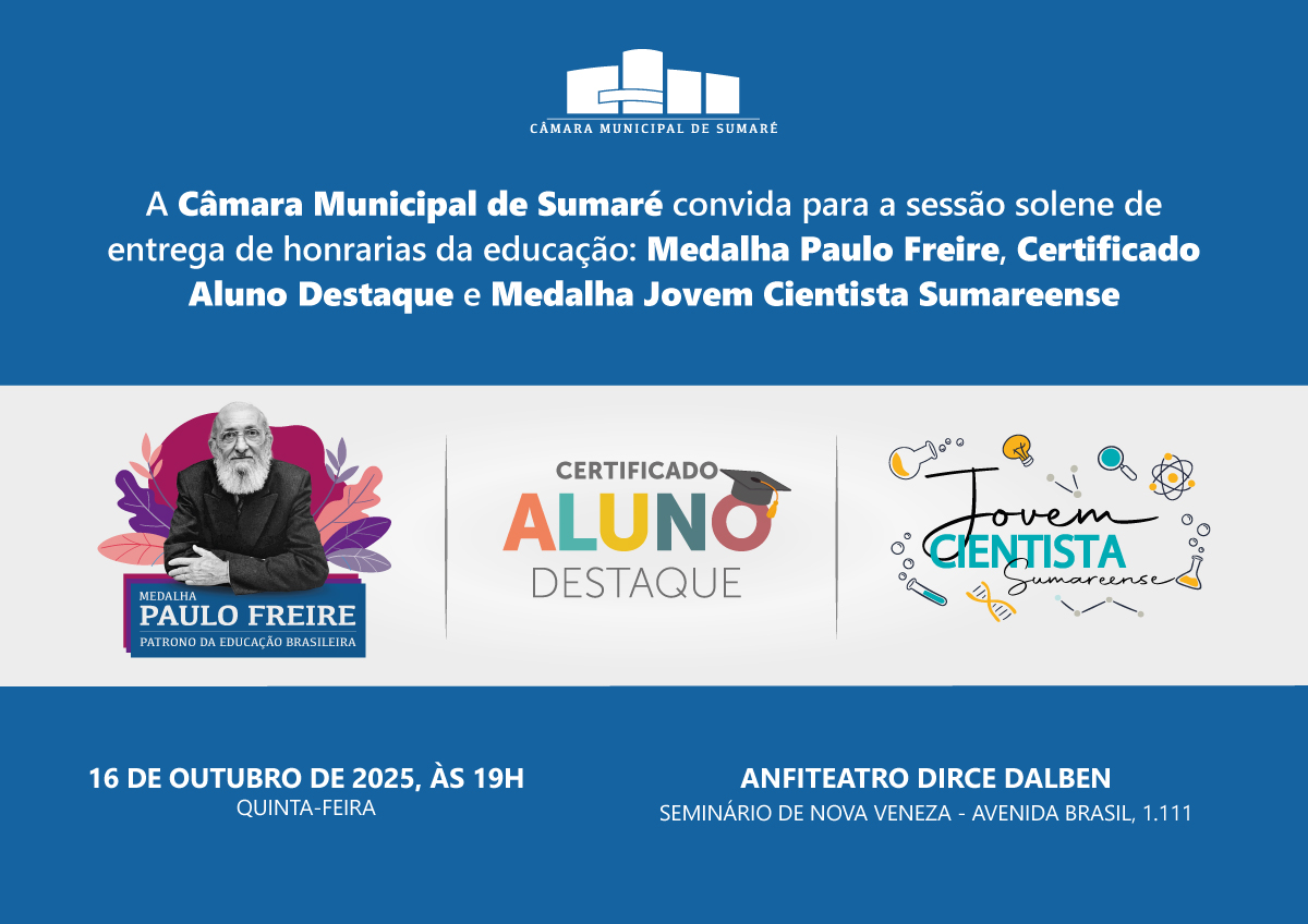 A Câmara Municipal de Sumaré realiza sessão solene para a entrega de honrarias da educação. O evento acontece nesta quinta-feira (16), às 19h, no anfiteatro Dirce Dalben, no antigo Seminário de Nova Veneza (Avenida Brasil, 1.111). A entrada é gratuita, e a sessão será conduzida pelo presidente do Legislativo, vereador Hélio Silva (Cidadania). Entre quase 50 homenageados, os vereadores farão a entrega da Medalha Paulo Freire a 19 educadores de destaque. Também serão entregues 16 Medalhas Jovem Cientista Sumareense e 14 Certificados de Aluno Destaque.