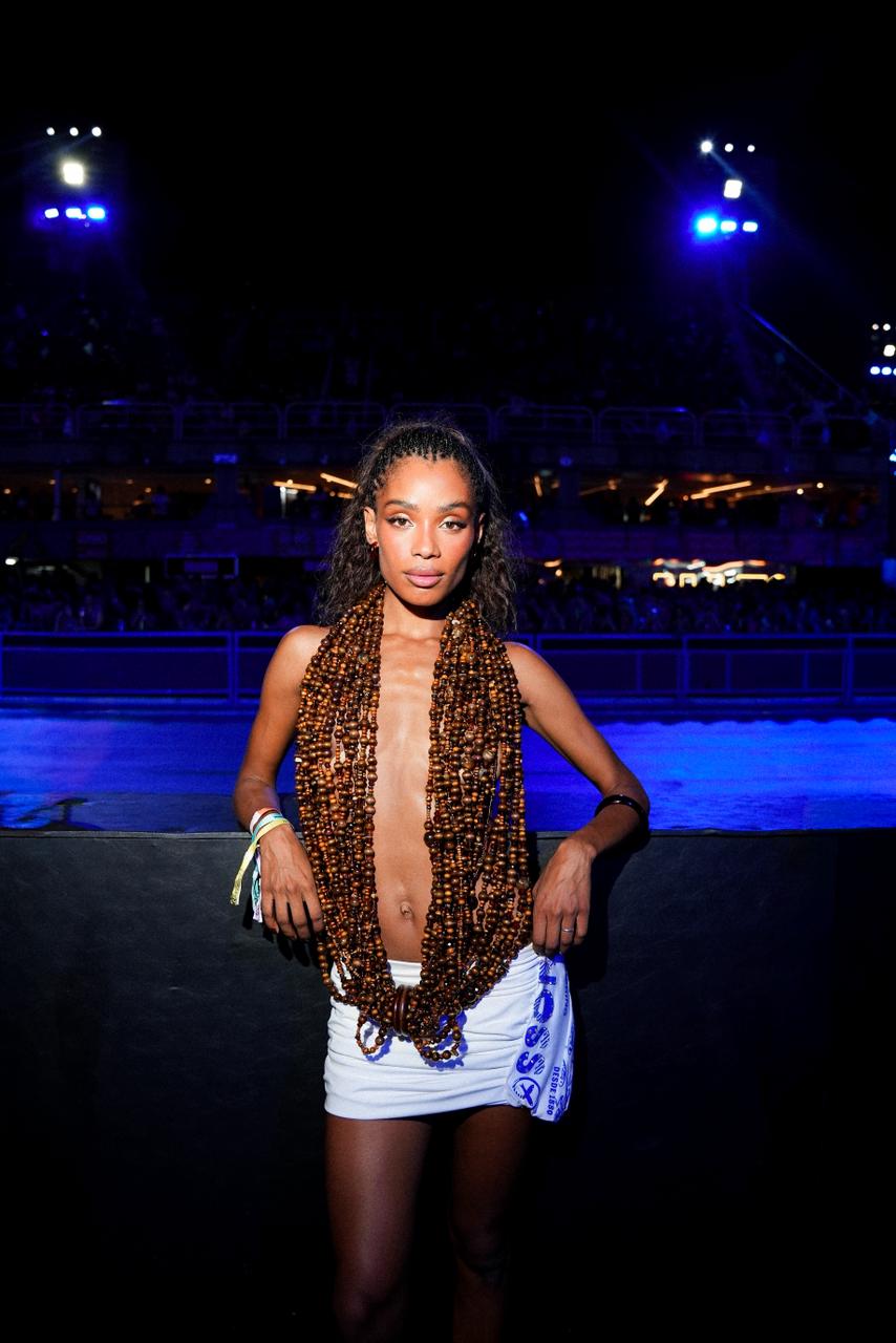 Entre os destaques, o top estruturado com aplicações metalizadas e franjas de cristal reforça o efeito “jewelry dressing” (quando a roupa se confunde com joia) uma das tendências que mais bombaram nesta temporada. Tops feitos de pedrarias, com muito brilho e acabamento minucioso, surgem como peça principal do look, assumindo protagonismo absoluto na produção.