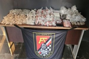 Durante a ação, foram apreendidos R$ 116,40 em dinheiro, além de diferentes tipos de drogas: 0,410 kg de crack, 1,360 kg de maconha, 1,196 kg de cocaína, 0,168 kg de “dry”, 0,832 kg de lança-perfume (distribuídos em 25 frascos) e 0,016 kg de droga sintética.