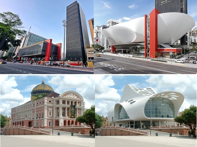 A seguir, veja a foto original de cada monumento e seus arquitetos originais, seguido da versão reinterpretada em estilo modernista-curvilíneo, com explicações sobre o que mudou na visão das IAs para se adequar ao traço arquitetônico de Niemeyer.