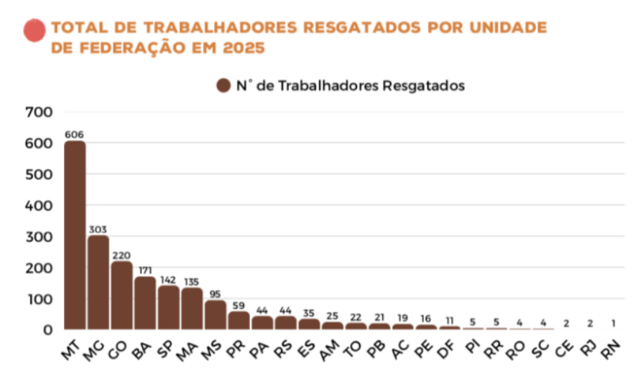 Já Minas Gerais, por mais um ano, se destaca entre os estados com mais casos de trabalho escravo, totalizando 35 registros e 303 trabalhadores resgatados em 2025, sendo o estado com maior número de ocorrências. Em seguida, aparecem Goiás, Bahia, São Paulo e Maranhão liderando os números de trabalhadores resgatados, sendo 220, 171, 142 e 135 pessoas resgatadas, respectivamente.