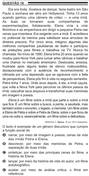 Na edição de 2022, uma das questões abordou, por exemplo, o documentário “Elena”, de Petra Costa, obra em que a diretora brasileira resgata a trajetória de sua irmã, que se mudou para Nova York com o sonho de ser atriz.