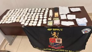 O abordado confessou a comercialização de entorpecentes. Na pochete, foram localizadas porções de maconha (0,021 kg), crack (0,014 kg) e cocaína (0,024 kg), além de R$ 146,00 em dinheiro.