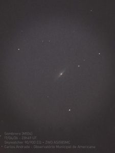 O Observatório Municipal de Americana (OMA) realizou um feito técnico de peso: registrou a galáxia Sombrero (M104), localizada na constelação de Virgem, a aproximadamente 30 milhões de anos-luz da Terra. A imagem foi capturada na noite da última sexta-feira (17), por meio do telescópio Skywatcher 90/900 EQ, acoplado a uma câmera planetária ZWO.