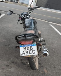 Ainda na tarde de sábado, durante patrulhamento pela Alameda dos Jacarandás, no Parque Manoel de Vasconcelos, a equipe abordou uma motocicleta com placa no padrão Mercosul que apresentava inscrição inexistente. Em vistoria, os policiais constataram que a numeração do chassi estava parcialmente suprimida. O condutor alegou ter comprado o veículo em leilão, porém a consulta do motor revelou que a moto, registrada em Minas Gerais, tinha baixa permanente e não havia registro de leilão. Ele também foi levado ao Distrito Policial e acabou preso.