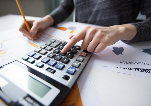 Close-up of female hand counting with calculator, papers all around on table. Businesswoman working with documents
