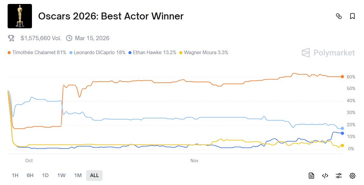 É nesse contexto que entram os números do Polymarket – plataforma americana de apostas. Na disputa por Melhor Ator, o mercado da plataforma aponta Timothée Chalamet (Marty Supreme) como favorito ao prêmio, com 61% de chance de vitória.