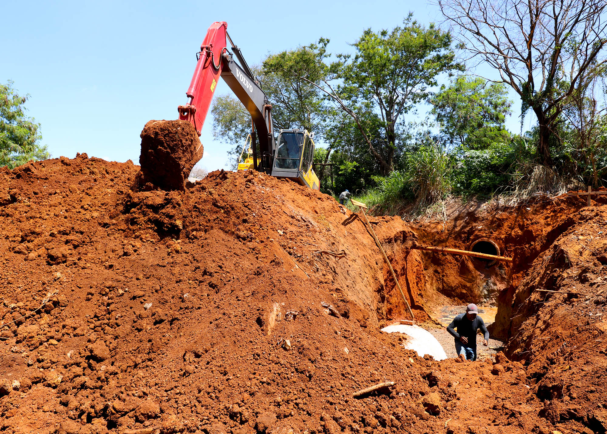 Após a realização da topografia do terreno, as equipes iniciaram a execução do sistema de drenagem, com a instalação de novas tubulações destinadas ao escoamento adequado das águas pluviais.