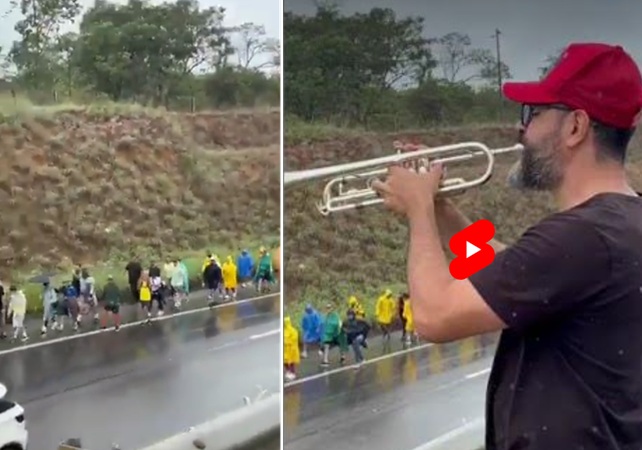 O apoiador de Lula conhecido como trompetista foi até a marcha do deputado federal Nikolas Ferreira (PL-MG) e tocou o berrante em direção aos apoiadores. O grupo realiza caminhada de 240 km pedindo a liberdade do ex-presidente Jair Bolsonaro.