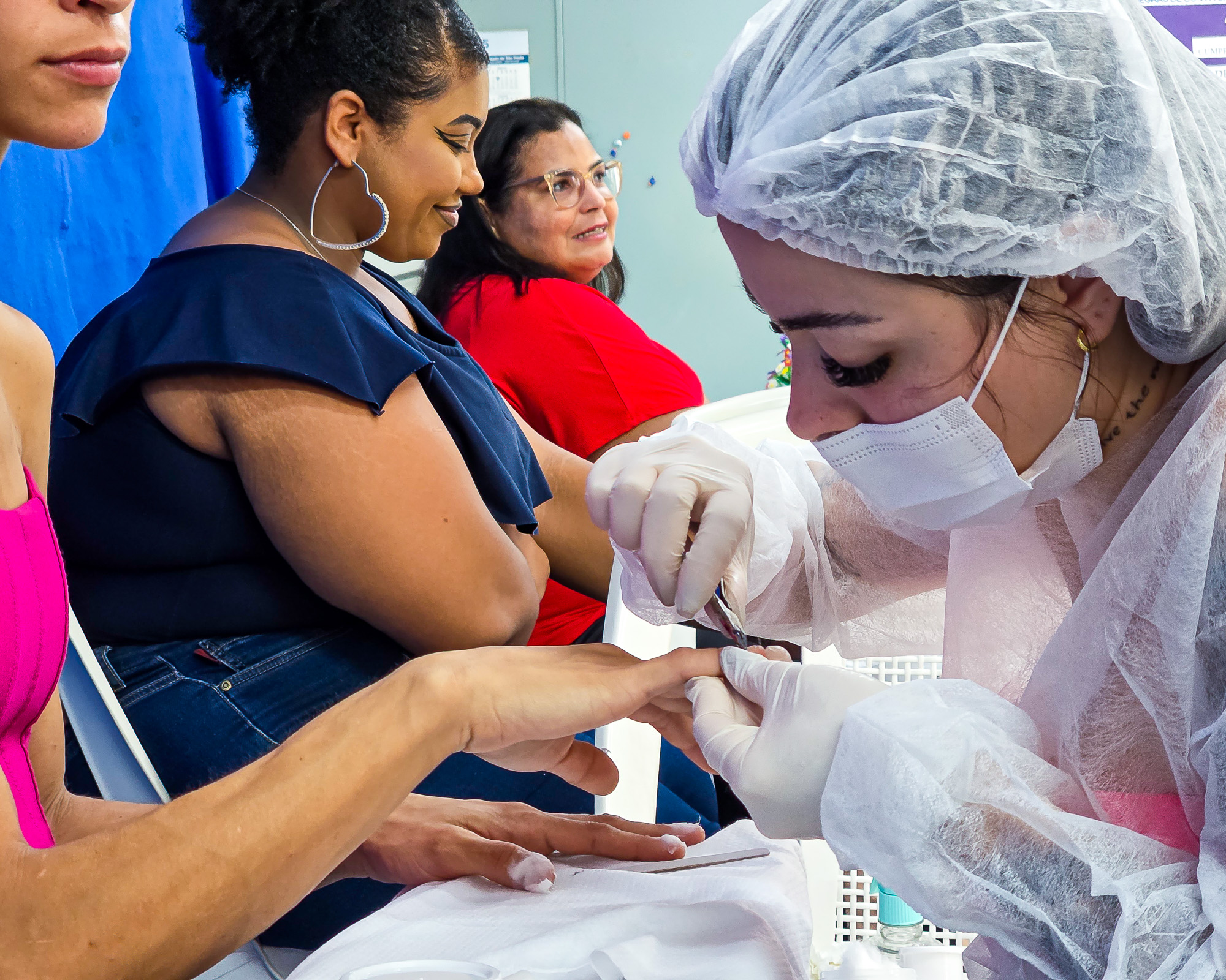 No CRAS III, no Bosque das Árvores, as alunas já estão na parte prática do curso de manicure e pedicure, executando as técnicas que aprenderam com a professora Fernanda Belleza. O conteúdo aborda organização do material, ergonomia, técnicas específicas e habilidades de higienização, corte, lixamento, hidratação e esfoliação, colocação de unhas postiças e de decoração, atendendo às normas de biossegurança. Os encontros incluem também o projeto integrador no qual poderão planejar a gestão da carreira, a organização do ambiente e os processos de trabalho, além da elaboração do portfólio.
