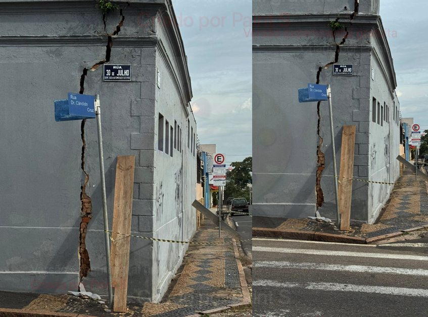 Um imóvel localizado na Rua Doutor Cândido Cruz, esquina com a Rua 30 de Julho, apresenta rachaduras estruturais severas, visíveis em toda a fachada, indicando risco iminente de desabamento. Segundo consta, o prédio pertence à família Marin.