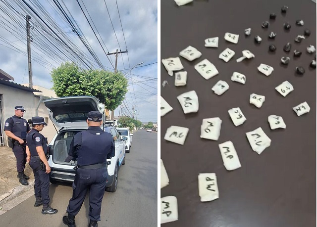 Durante patrulhamento, os GCMs Larcio e M. Alves foram acionados por um transeunte que relatou que um indivíduo estaria realizando a venda de entorpecentes na via pública. No local, a equipe abordou G. J. S, de 18 anos. Em sua mochila, foram encontradas duas embalagens contendo 50 porções de drogas conhecidas como “meleka/Crombow”