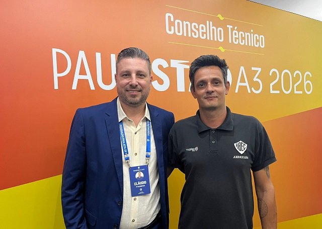 Presidente Cláudio Bonaldo e o vice-presidente Vinicius Carreon representaram o R Branco Esporte Clube no conselho técnico do Campeonato Paulista Série A-3 2026 (Foto: Gustavo Tomazeli / Comunicação RBEC)