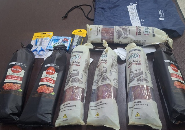 De acordo com o relato, o homem pagou por algumas mercadorias, mas escondeu sete peças de salame, avaliadas em aproximadamente R$ 50 cada, dentro de uma bolsa que carregava, tentando deixar o estabelecimento sem efetuar o pagamento.
