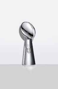 Projetado e confeccionado artesanalmente pela Tiffany & Co. pela primeira vez para o inaugural Super Bowl® I, em 1967, o Troféu Vince Lombardi simboliza o auge da glória no futebol americano. Três anos após sua introdução, em 1970, o troféu foi rebatizado em homenagem ao falecido técnico do Green Bay Packers, Lombardi, que conduziu a equipe à vitória nos dois primeiros Super Bowls. O troféu foi originalmente concebido por Oscar Riedener, ex-vice-presidente da Tiffany & Co., que esboçou o design básico em um guardanapo durante uma reunião em 1966 com o então comissário da NFL®, Pete Rozelle. O design apresenta uma bola padrão de futebol americano na posição de chute.
