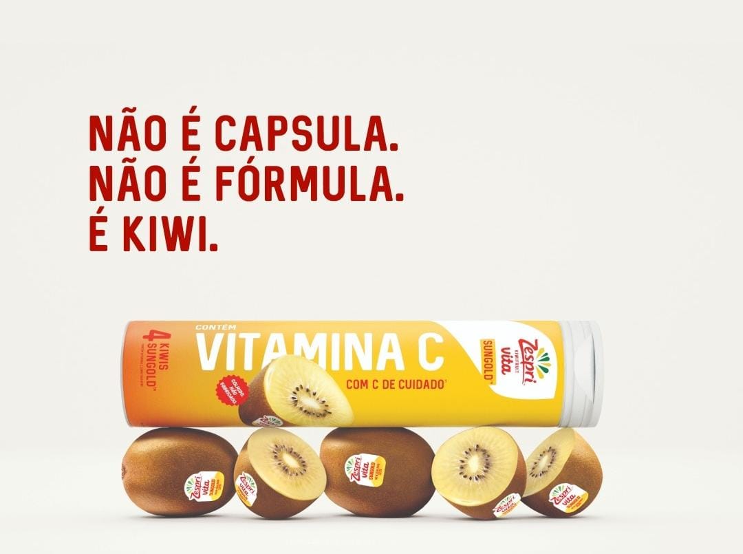 Em sua nova campanha a empresa leva aos pontos de venda tubos que lembram os clássicos suplementos de vitamina C. Só que, em vez de cápsulas artificiais, o que se encontra é o kiwi Zespri™ Vita SunGold™, doce, suculento e vibrante, capaz de oferecer em apenas uma unidade 100% da necessidade diária de vitamina C, um importante nutriente conhecido pelos consumidores como aliado no sistema imune.