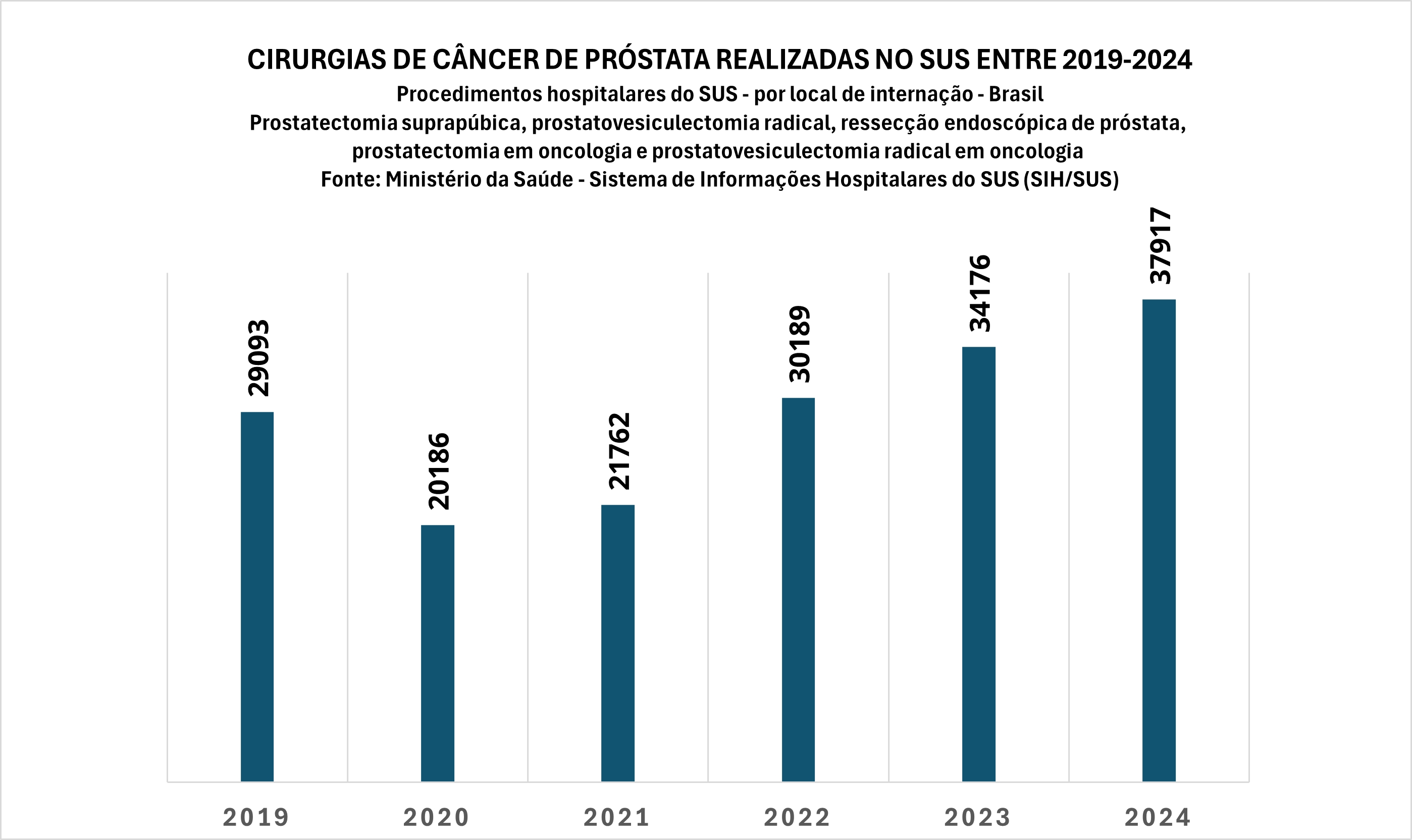 O Brasil assistiu, entre 2019 e 2024, a um movimento de queda brusca e retomada vigorosa nas cirurgias de câncer de próstata realizadas pelo Sistema Único de Saúde (SUS). É o que mostram os dados analisados pelo Instituto de Urologia, Oncologia e Cirurgia Robótica (IUCR) a partir do Sistema de Informações Hospitalares (SIH/SUS), do Ministério da Saúde.