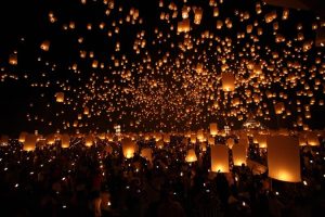 A origem das lanternas está ligada ao antigo povo Lanna, que vivia no norte da Tailândia. Segundo a tradição, os balões de papel eram lançados ao céu durante a lua cheia do 12.º mês lunar como forma de enviar orações às relíquias de Buda guardadas nos céus. Com o tempo, o gesto de devoção se transformou em um espetáculo visual que encanta tailandeses e turistas do mundo todo. Hoje, mesmo com regras mais rígidas para o lançamento das lanternas nas cidades, a celebração continua viva, com casas e templos decorados por pequenas luzes e velas que mantêm acesa a essência espiritual do Festival das Lanternas.