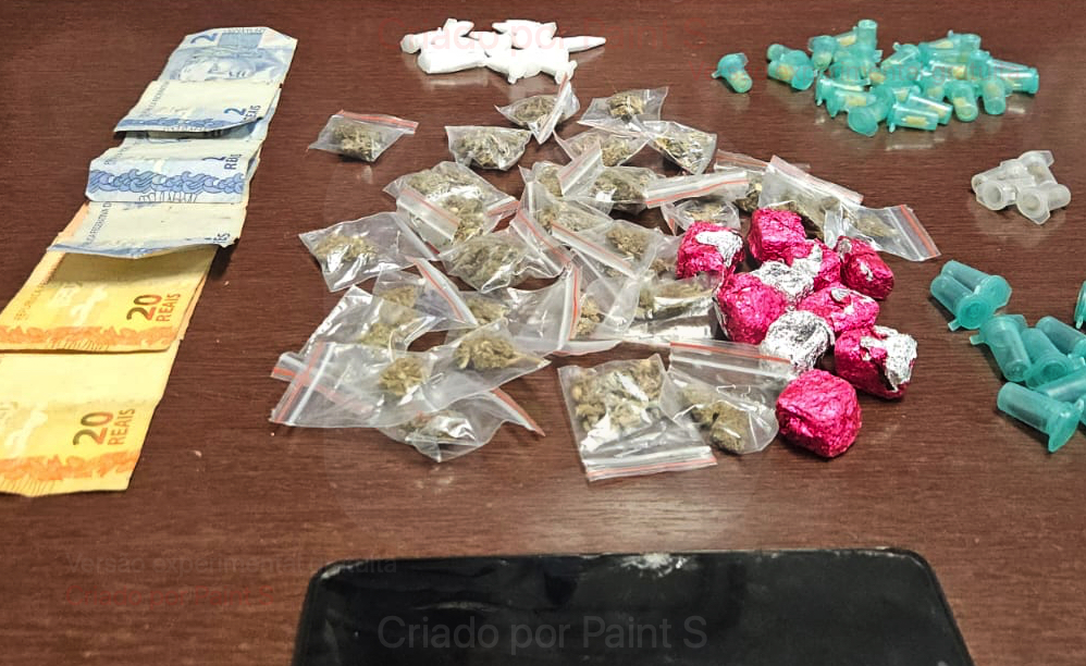 Realizada a busca pessoal foi localizado em sua posse dinheiro e um smartphone. Em diálogo, inicialmente informou estar de passagem, porém questionado sobre a pochete que portava, não soube explicar.